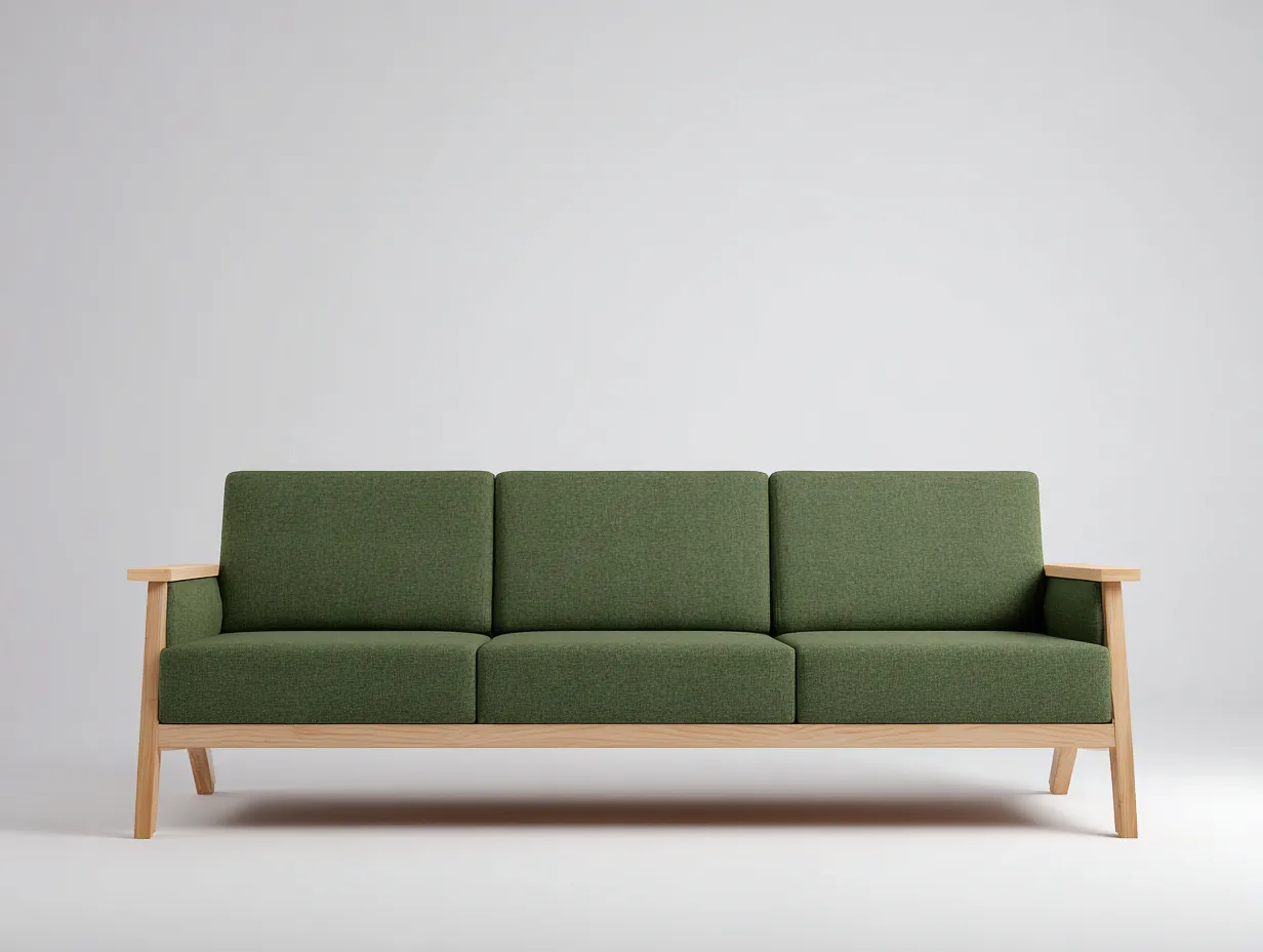 La estructura combina madera en tono natural con superficies acolchadas en color verde musgo, una unión cromática que transmite calidez y conecta bien con entornos exteriores rodeados de vegetación, cerámica o piedra. Los brazos rectos con remate de madera visible refuerzan la identidad del diseño y añaden un detalle funcional útil en el uso cotidiano. El tapizado presenta una textura visual uniforme que aporta una presencia sobria, mientras que la base de madera contribuye a una lectura ligera pero estable del conjunto. El resultado es una pieza equilibrada, fácil de coordinar con otros elementos de jardín o terraza de inspiración actual y natural.