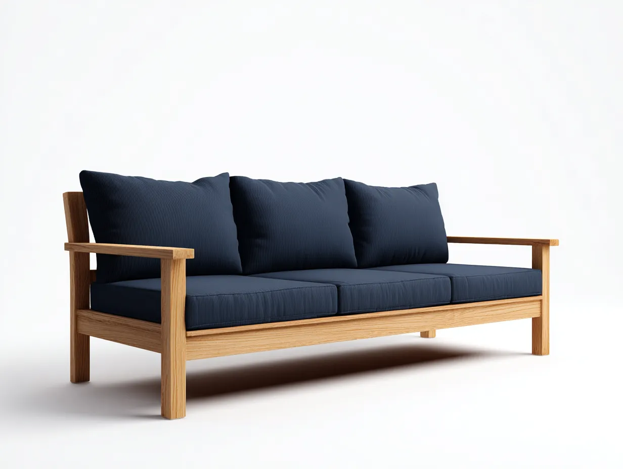 La estructura está elaborada en madera con acabado en tono claro, una opción que aporta calidez visual y favorece la combinación con pavimentos cerámicos, piedra, fibras naturales y vegetación ornamental. El asiento y el respaldo presentan superficie textil en color azul marino, un tono sobrio que introduce contraste y ayuda a construir una presencia elegante sin recargar el ambiente. Los brazos rectos y el armazón de líneas definidas refuerzan la sensación de estabilidad, mientras que la combinación entre madera clara y tapizado oscuro encaja con estilos contemporáneos, mediterráneos y naturales habituales en el mercado español de mobiliario exterior.