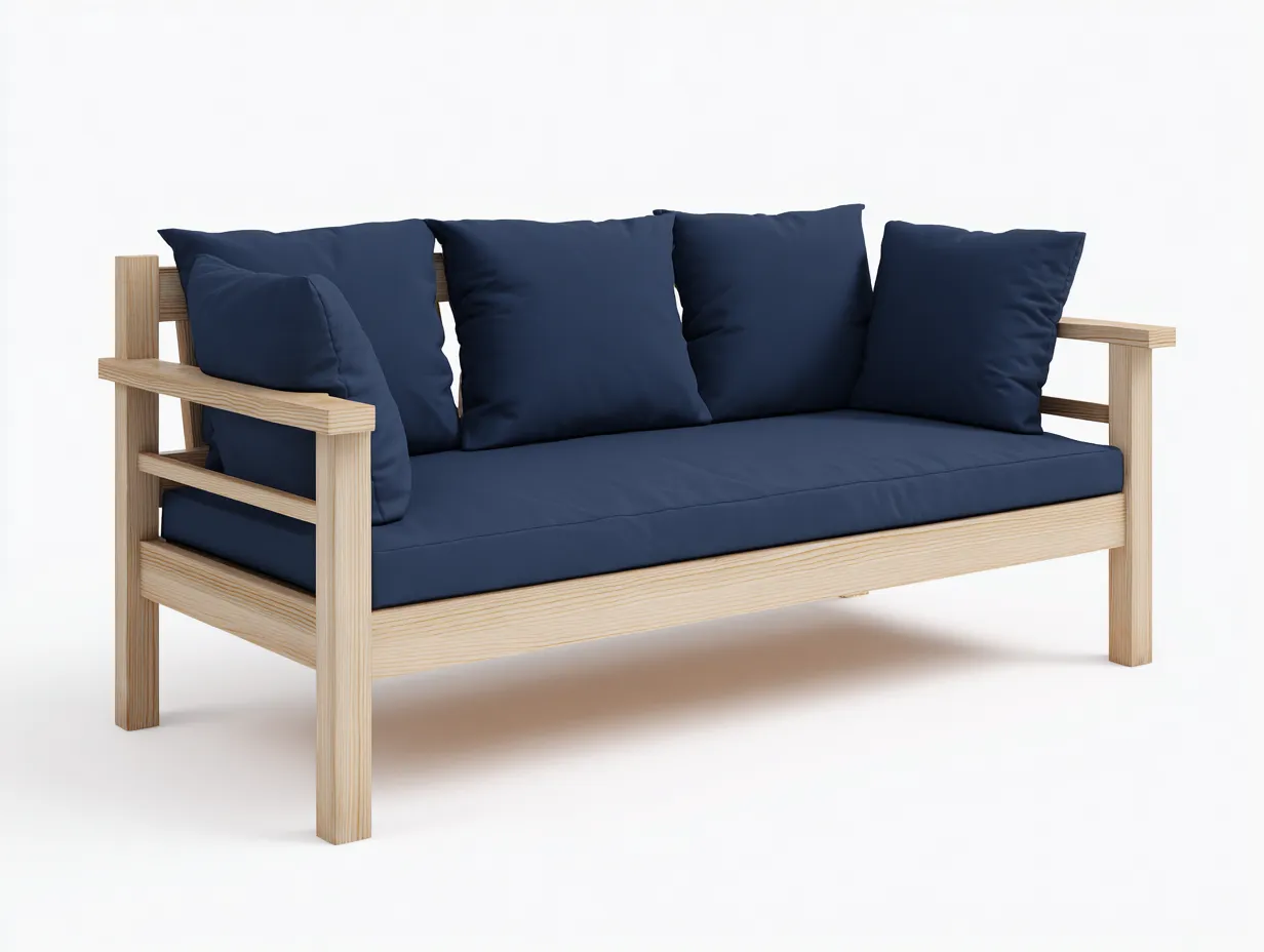 La estructura está fabricada en madera con acabado en tono natural, una elección que aporta calidez visual y favorece la integración con espacios exteriores de inspiración mediterránea, contemporánea o natural. Los laterales y apoyabrazos presentan líneas rectas y sección marcada, reforzando la sensación de solidez del conjunto. El asiento y el respaldo incluyen acolchado en color azul marino, un tono sobrio que contrasta con la madera clara y ayuda a construir una presencia elegante sin resultar recargada. La combinación cromática encaja bien con pavimentos cerámicos, vegetación ornamental y textiles de exterior de tonos neutros.