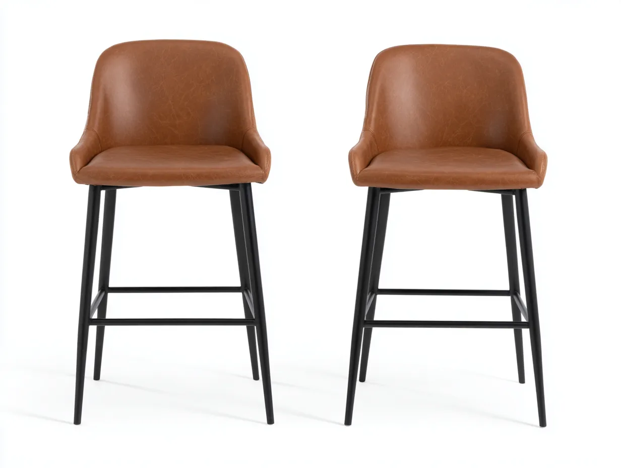 El asiento y el respaldo están revestidos en cuero sintético marrón con superficie de aspecto suave y acabado uniforme, pensado para ofrecer una imagen sobria y fácil de combinar. La base está fabricada en metal negro con patas finas y estructura reforzada, lo que favorece una buena estabilidad durante el uso cotidiano. Los travesaños horizontales actúan además como apoyo para los pies, mejorando la postura al sentarse y reforzando el confort en espacios de comedor con barra.